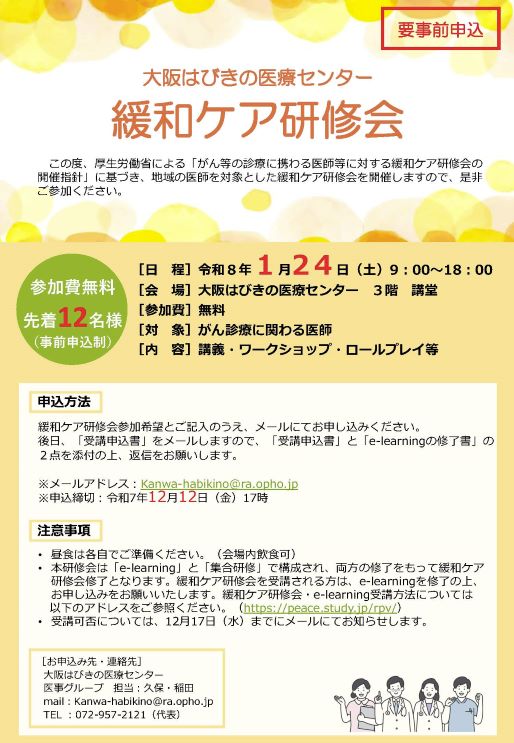 2026年1月24日(土)9:00~18:00緩和ケア研修会を開催します。 がん診療に関わる医師の参加を募集します。 申し込み締め切りが12月12日(金)17時となっておりますので、たくさんのご参加お待ちしております。 詳細はこちらをご覧ください。